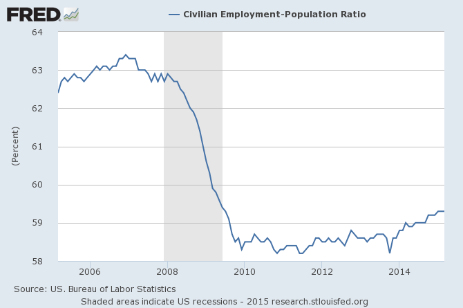 However, our employment rate never recovered from the Second Depression. As you can see in this graph, it fell from 63% to 58%, and has now only risen back to 59%: