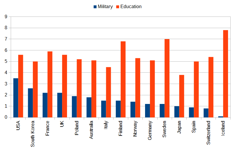 If we do want to compare military spending to other forms of spending, I think we should do that in international perspective as well. Here is a graph of education spending versus military spending as a portion of GDP, in several First World countries (military from SIPRI and the CIA, and education from the UNDP):