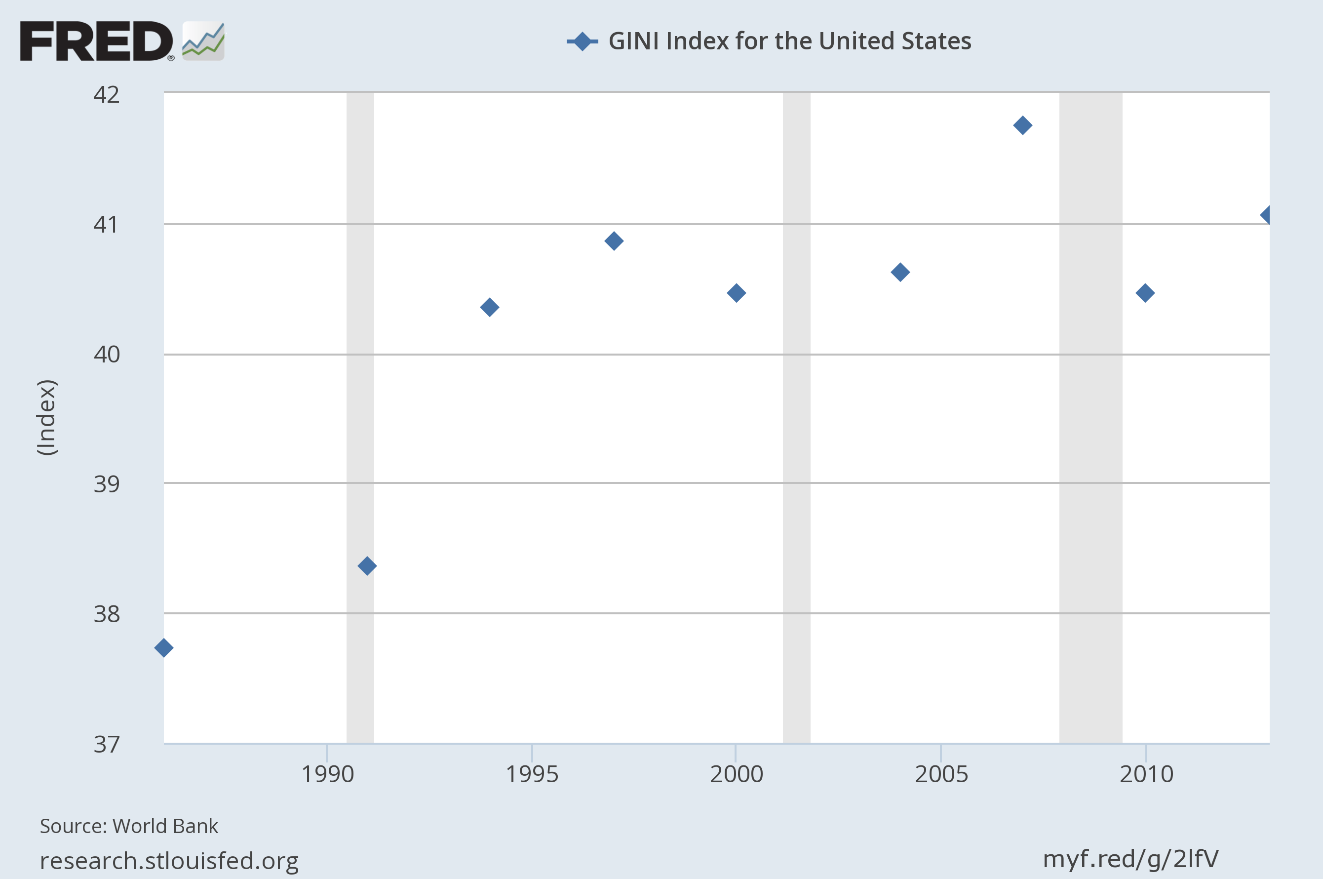The Gini index, a standard measure of income inequality, is only collected every few years, yet shows a clear rising trend from 37% in 1986 to 41% in 2013: