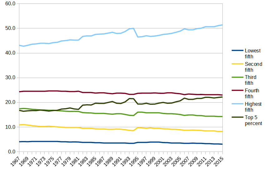 This is what it looks like if you use US Census data, broken down by groups of 20% and the top 5%; notice how since 1977 the top 5% have taken in more than the 40%-60% bracket, and they are poised to soon take in more than the 60%-80% bracket as well: