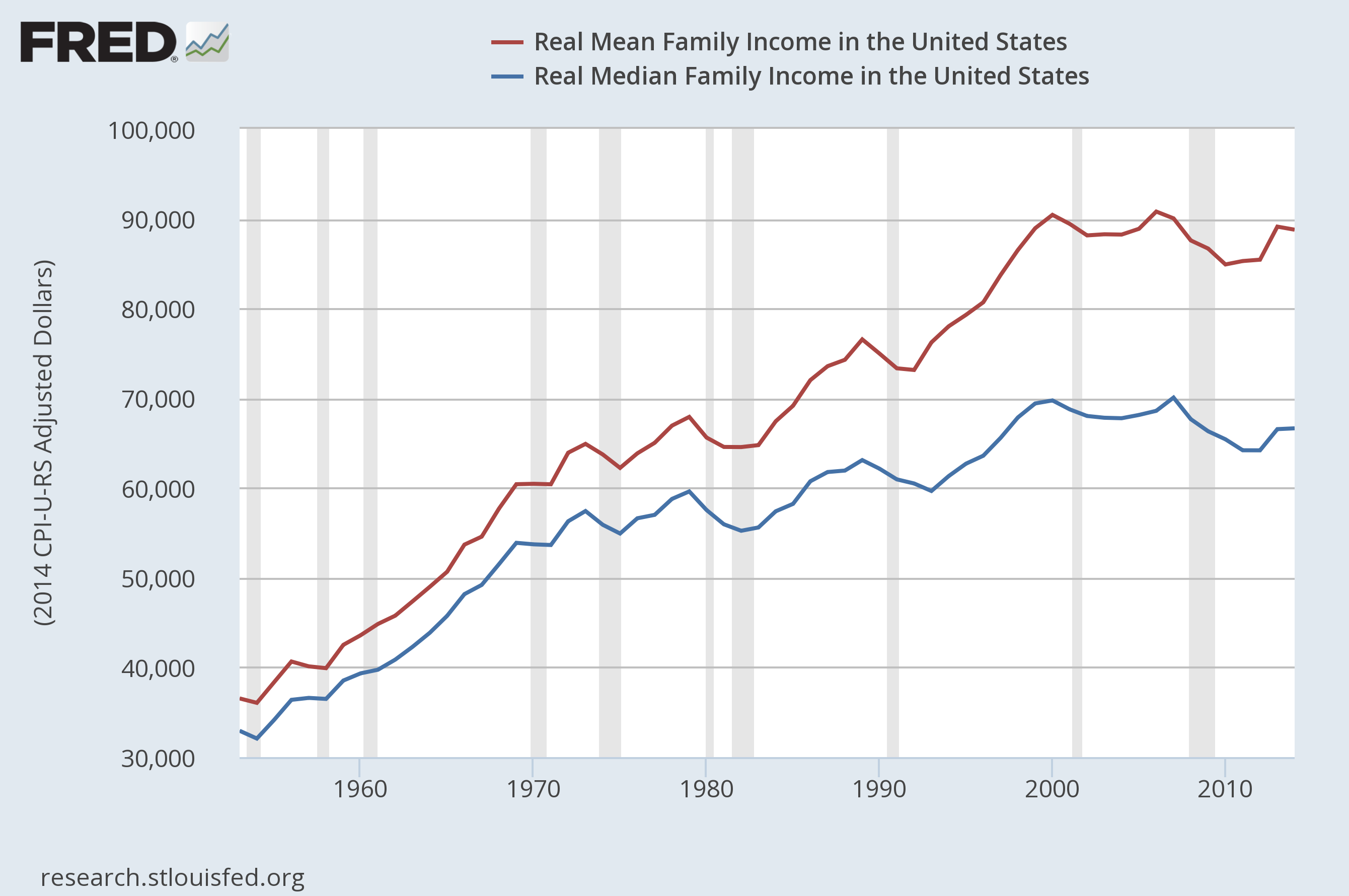 So if we look at mean income versus median income in the US over time, this is what we see: