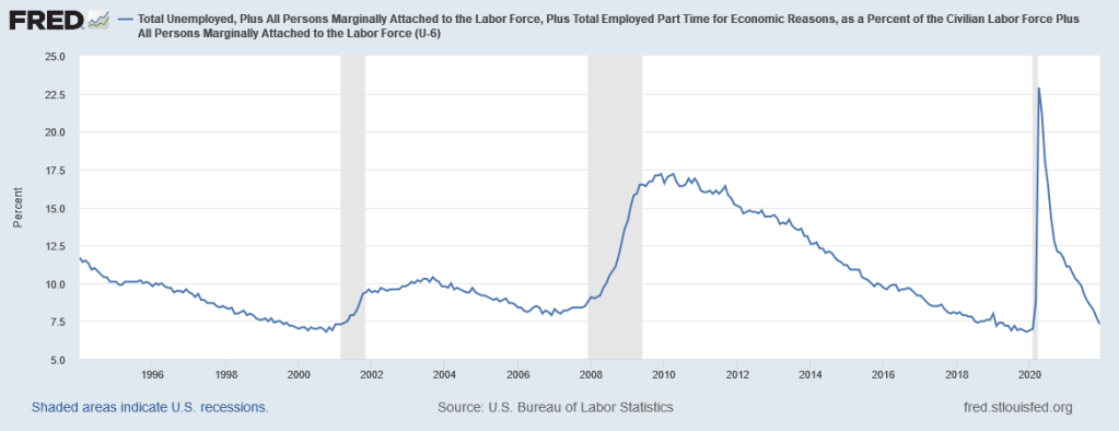 But I don’t think the effects on the labor market will be so transitory. The strikes and quits we’ve been seeing lately really are at a historic level, and they are likely to have a long-lasting effect on how work is organized. Employers are panicking about having to raise wages and whining about how “no one wants to work” (meaning, of course, no one wants to work at the current wage and conditions on offer). The correct response is the one from Goodfellas [language warning].