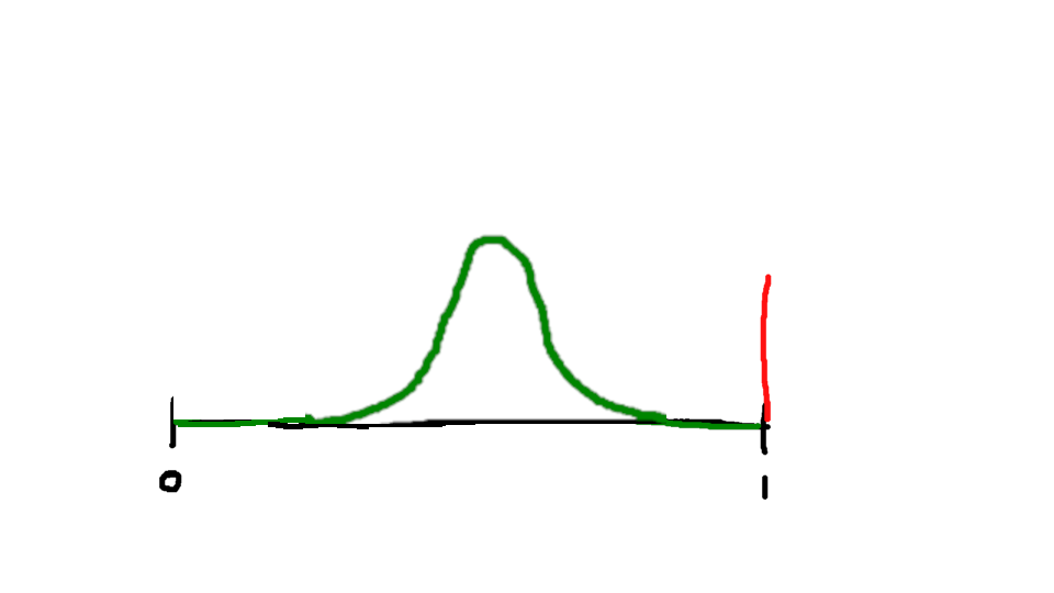 Neither uniform nor exponential has the nice bell-curve shape for innate activation we might have hoped for. There is another class of distributions, beta distributions, which do have this shape, and they are sort of tractable—you need something called an incomplete beta function, which isn’t an elementary function but it’s useful enough that most statistical packages include it.