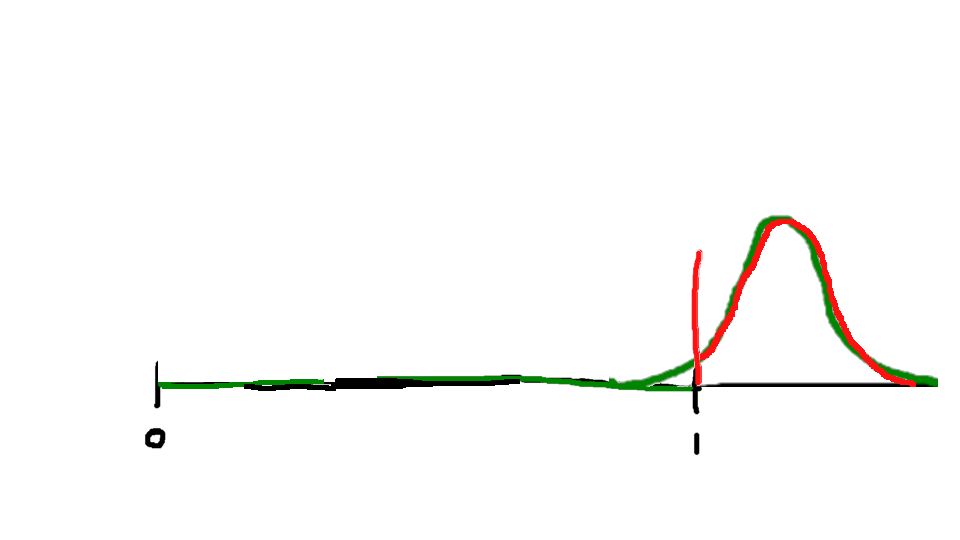 Neither uniform nor exponential has the nice bell-curve shape for innate activation we might have hoped for. There is another class of distributions, beta distributions, which do have this shape, and they are sort of tractable—you need something called an incomplete beta function, which isn’t an elementary function but it’s useful enough that most statistical packages include it.