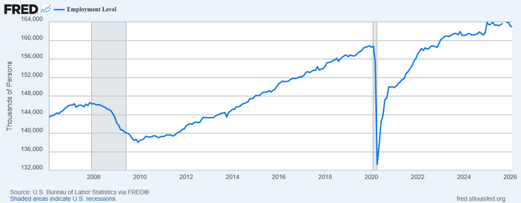 From 2009 to 2019, US employment grew from 138 million to 159 million, growing at 1.4% per year. Obviously it collapsed during the 2020 recession, but then it recovered to 158 million by the end of 2022. It now stands at 163 million, only 0.7% growth per year since 2022. Since January 2025 it has actually fallen from a peak of 164 million.