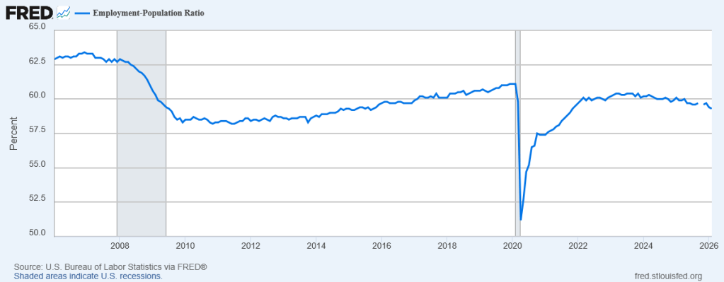 Because our population is growing (albeit not as much as it once was, because immigration has collapsed after Trump’s crackdowns), this actually looks even worse when you consider the employment rate, the ratio between the number of people employed and the total population: