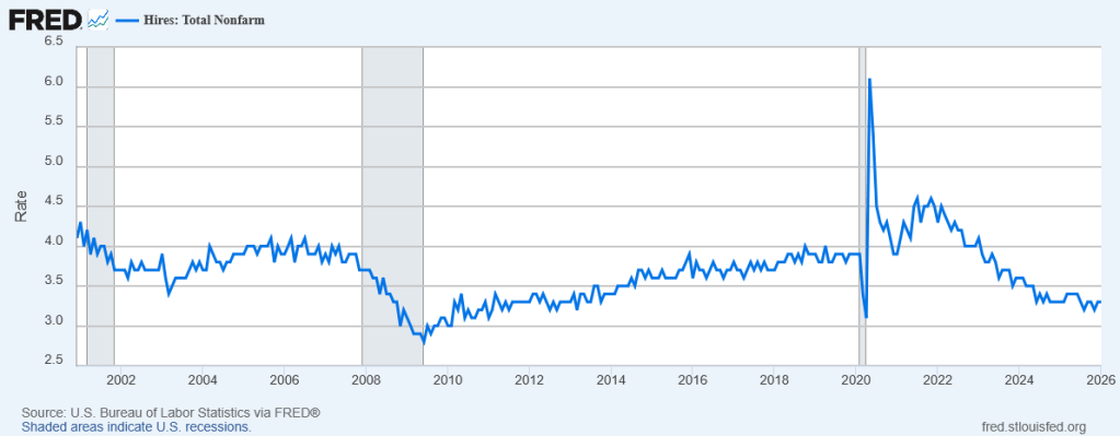 The hiring rate is now the lowest it has been since the 2020 recession—and not much higher than it was at the trough of the 2020 recession!