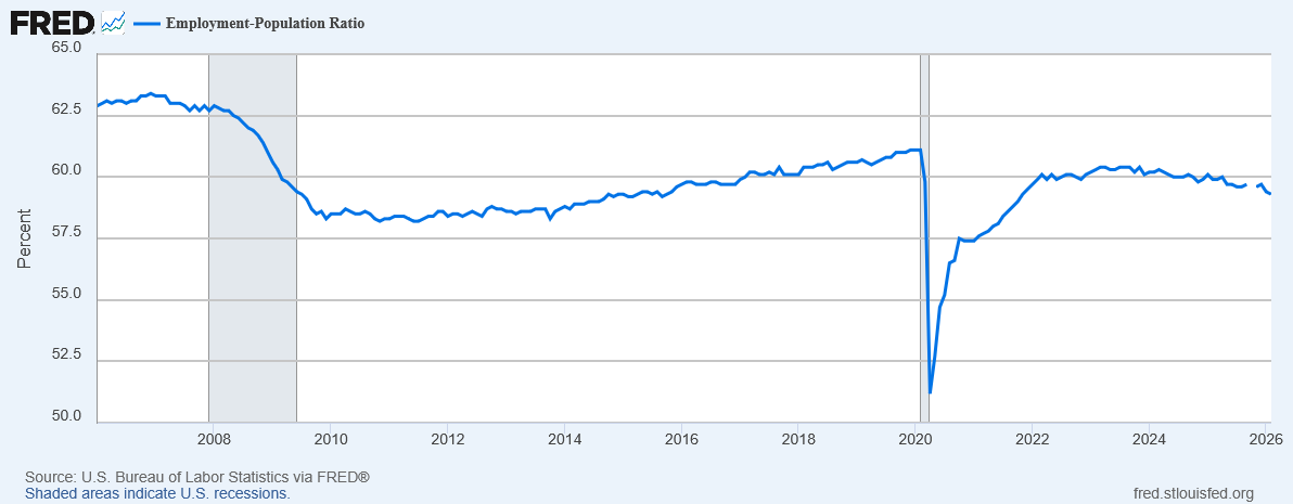 Because our population is growing (albeit not as much as it once was, because immigration has collapsed after Trump’s crackdowns), this actually looks even worse when you consider the employment rate, the ratio between the number of people employed and the total population: