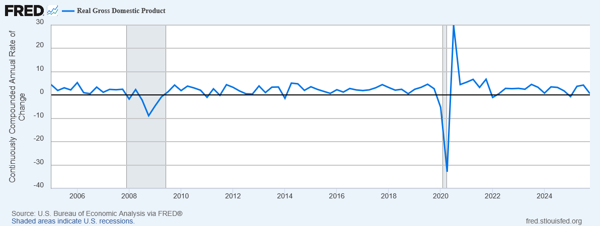 Sure, it had a huge drop in the 2020 recession, but it grew very fast in the recovery, and since then has fluctuated a bit, but generally averaged about 2.5% per year—which is pretty good for a highly-developed country. We had negative growth in the first quarter of 2025 and slow growth in the fourth quarter, but the second and third quarter both had strong growth to make up for it. Overall real GDP growth for 2025 as a whole was a perfectly respectable 2.1%.