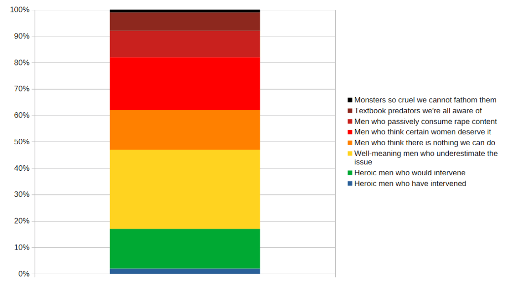 This still means that there is a lot we could do to make things better—especially about the “men who think some women deserve it” and “well-meaning men who underestimate the issue” categories, which are (in my estimation) the largest. But it’s a far cry from “any man you meet could be one of them” or “just teach men not to rape”.